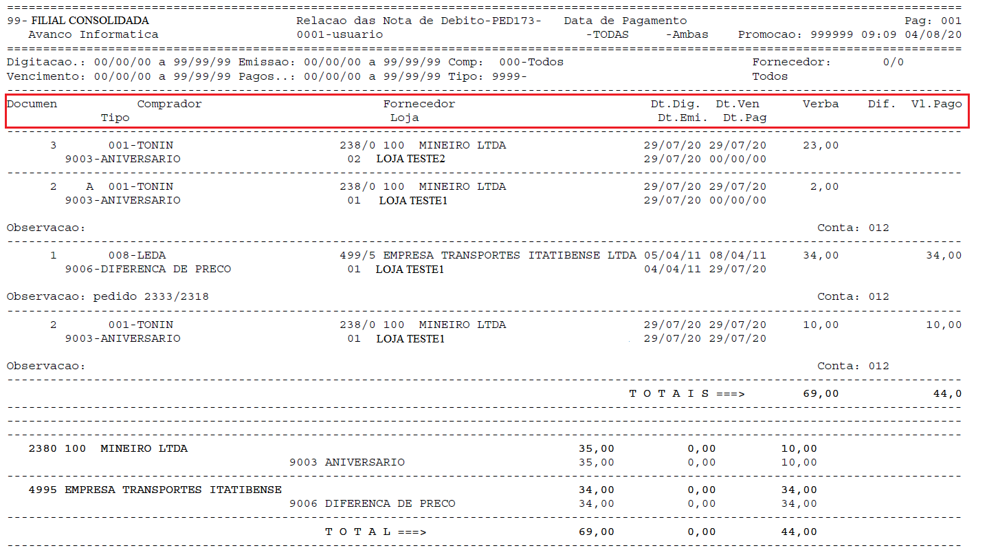 Dt. Pag: | Data de pagamento do documento, caso o mesmo já tenha sido pago. |