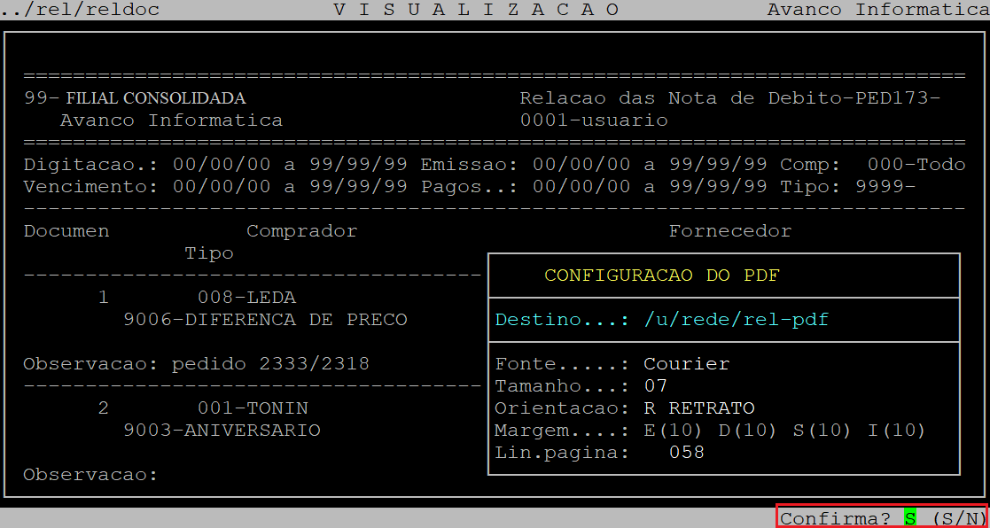 Assim que preencher os campos acima, pressione a tecla Enter ou S para confirmar e gerar o relatório, conforme o exemplo abaixo.