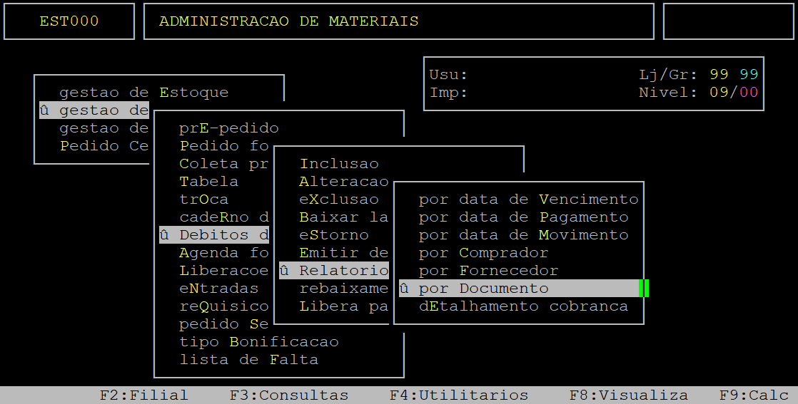 Localização: | Adm Materiais / Gestao de Compras / Debitos de Fornecedor / Relatorios / por Documento |