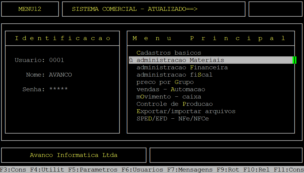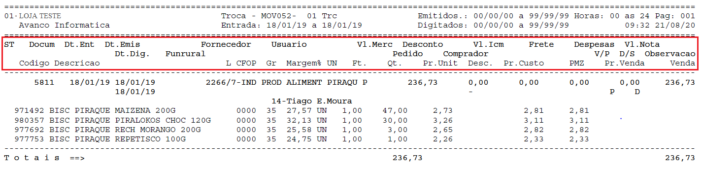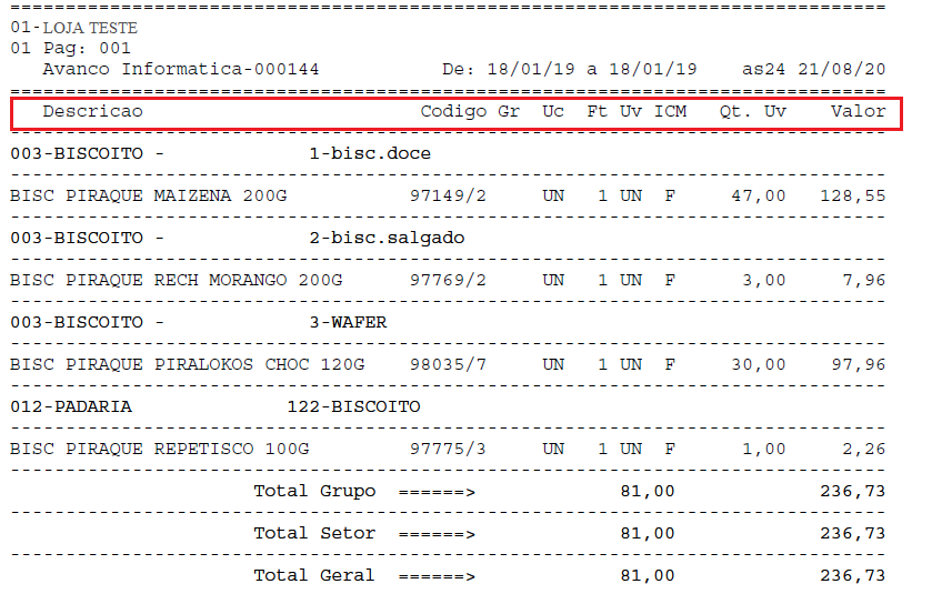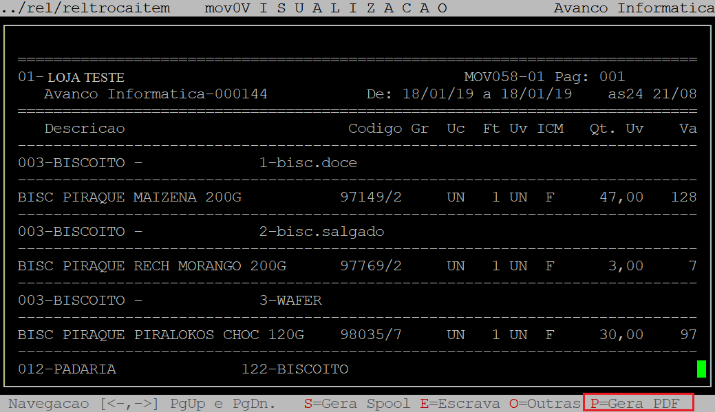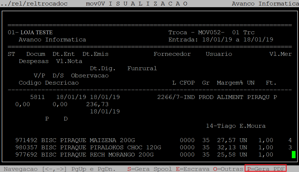 Assim que preencher os campos acima, pressione a tecla Enter ou S para confirmar e gerar o relatório, conforme o exemplo abaixo (os dados do relatório são meramente ilustrativos).