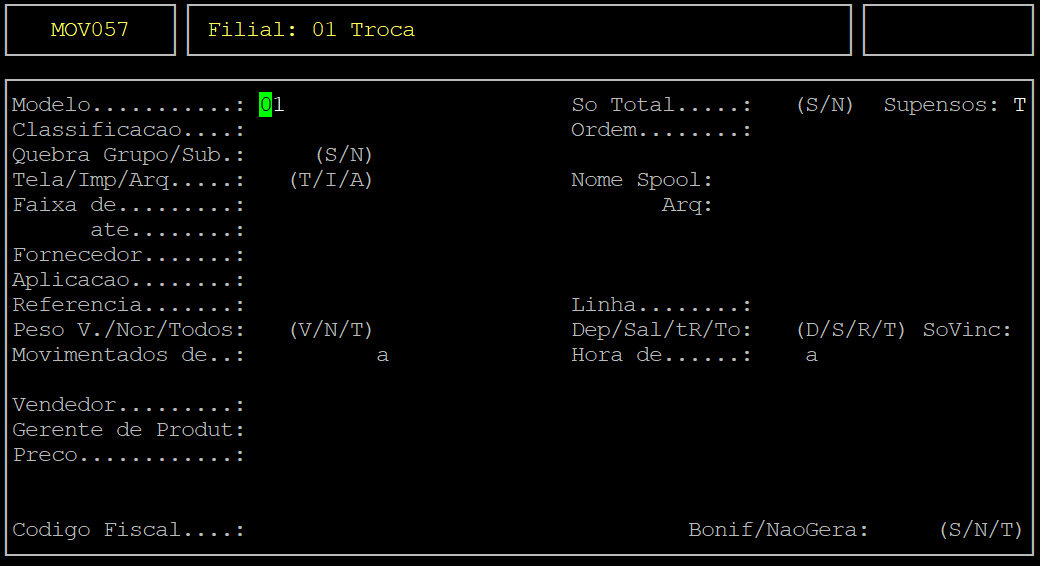 Peso V./Nor/Todos: | Informe a letra V para considerar produtos com peso variável, ou N para os produtos sem peso, ou T para considerar todos os produtos. | |