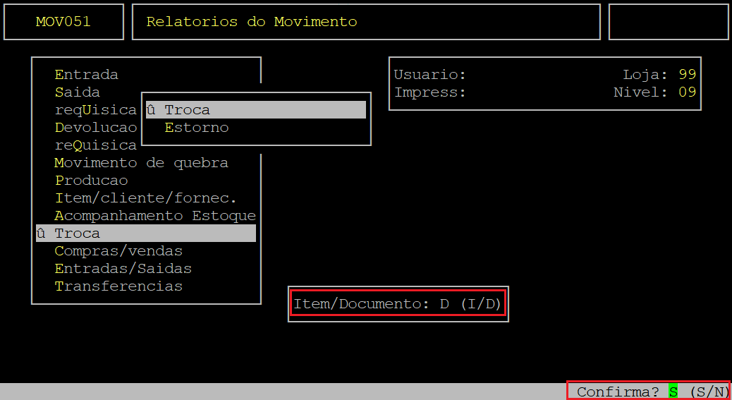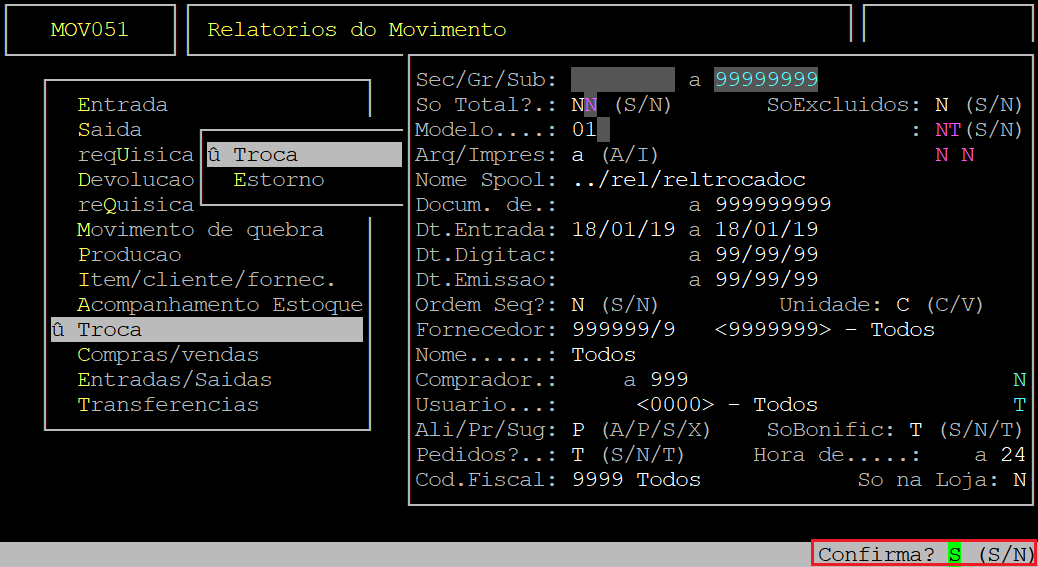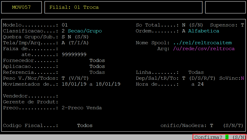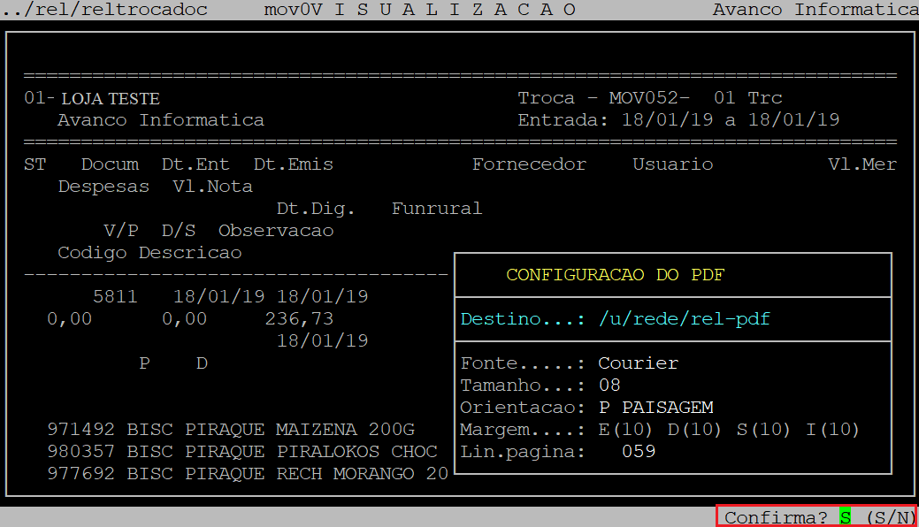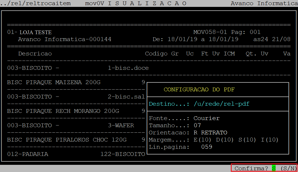 Em seguida, o sistema exibirá a pergunta "Confirma?", no qual deverá pressionar a tecla Enter ou a letra S para confirmar o tipo de relatório a ser gerado.