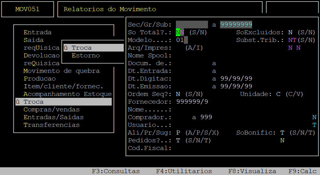 Informe o período inicial de digitação das trocas no primeiro campo (Dt. Digitac) e, pressione a tecla Enter. No segundo campo (a) informe o período final e, pressione a tecla Enter para prosseguir. Se não desejar utilizar esse filtro, deixe os dois campos sem preenchimento e, pressione a tecla Enter para considerar todos os períodos. |