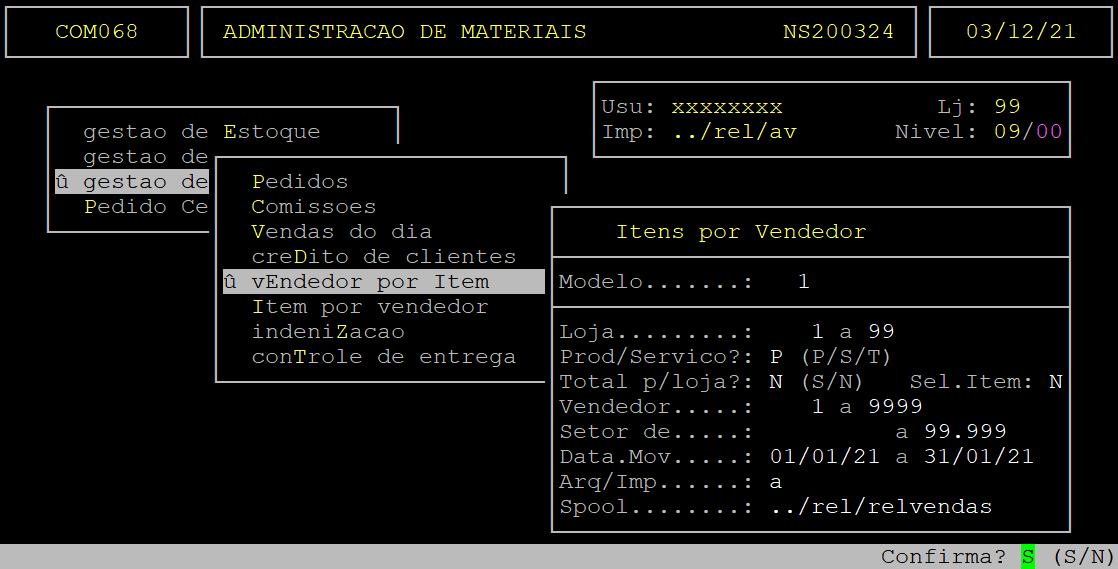 Total p/loja? | Informe a letra S pra totalizar o relatório por loja, ou N para não totalizar. | |