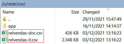 OBSERVAÇÃO: Neste diretório serão gerados dois arquivos csv com o nome do Spool, porém, um terá o acréscimo da palavra -doc e o outro a palavra -it (conforme do exemplo abaixo). A diferença é que um relatório terá informações do documento em geral e o outro terá informações do documento mais os produtos, respectivamente. |