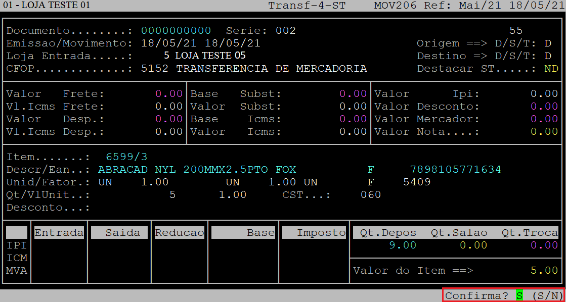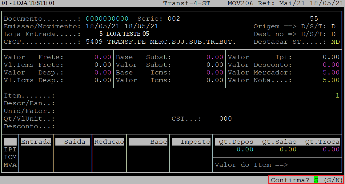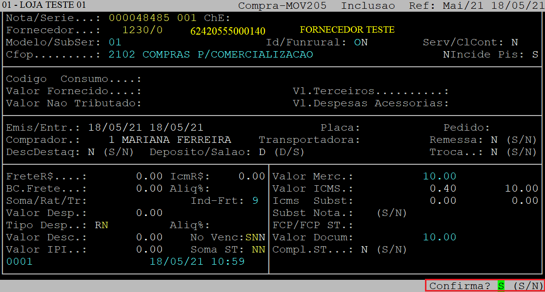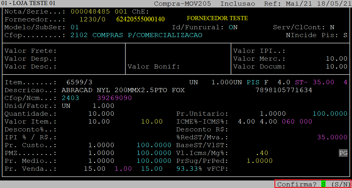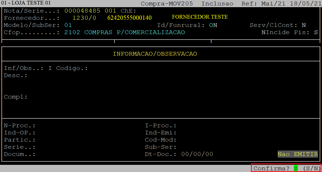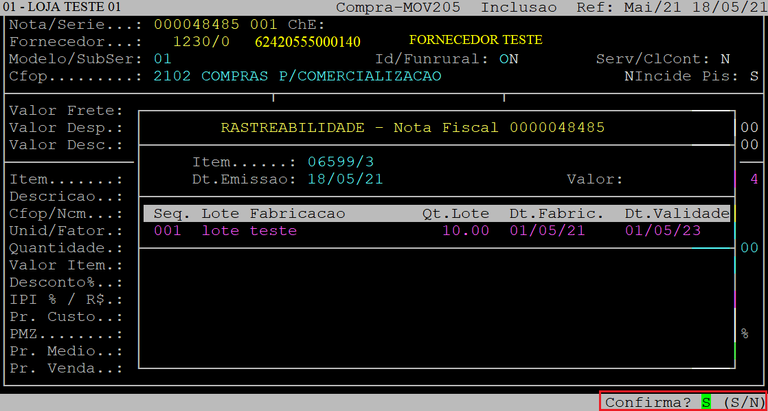 Ao ser exibida a pergunta " Confirma? ", aperte a tecla Enter ou informe a letra S para confirmar os dados do item.