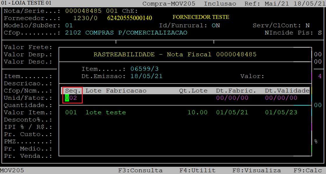 Depois, o cursor do teclado retornará para o campo Seq. Se desejar incluir mais lotes de fabricação do produto, repita o processo descrito anteriormente. Caso contrário, aperte a tecla Esc para finalizar.