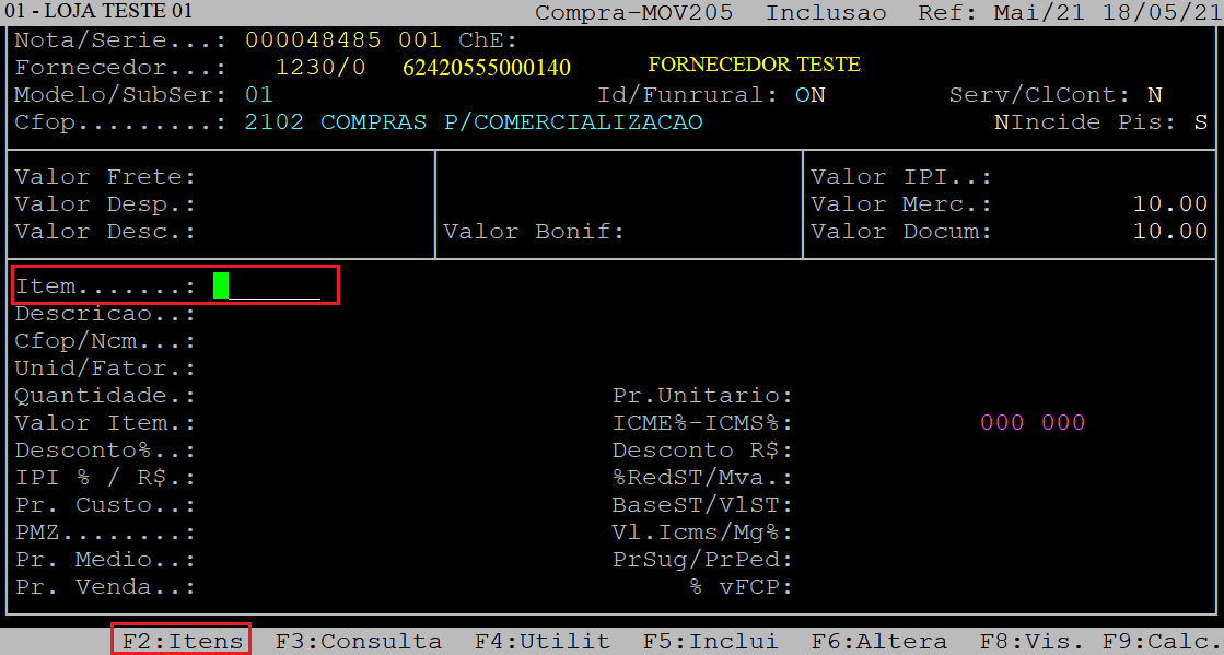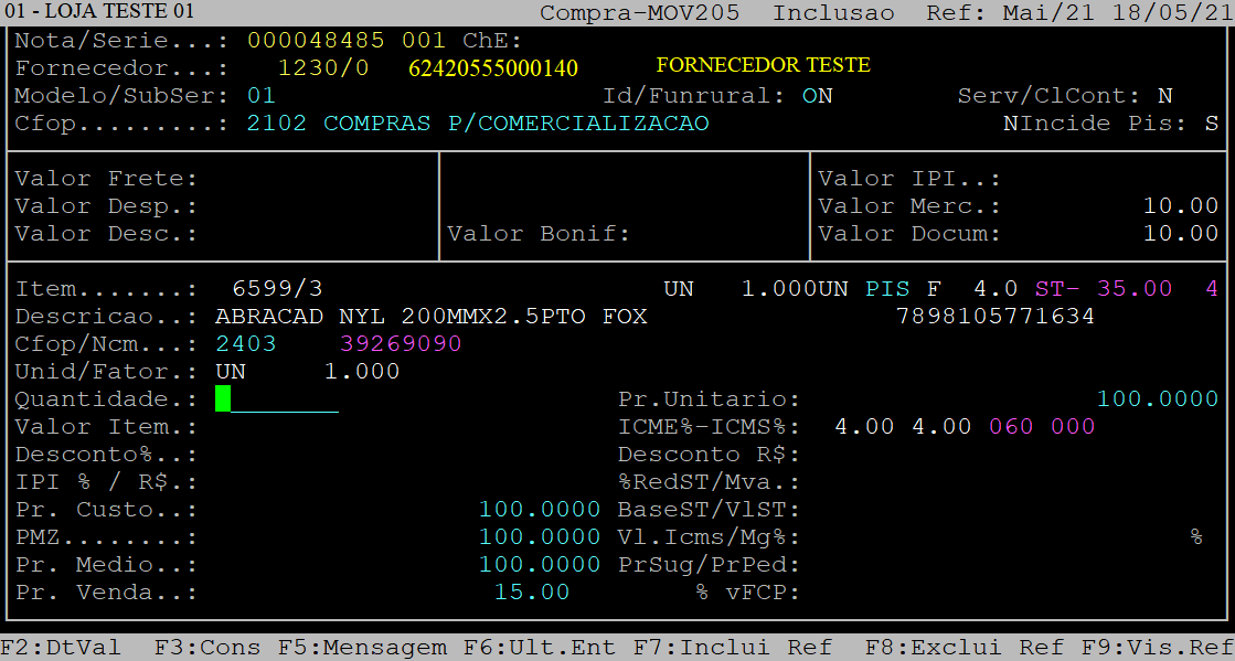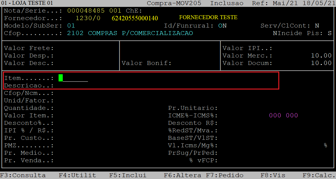 Vl.Icms/Mg%: | Esses campos serão preenchidos com o valor de ICMS e a porcentagem da margem, respectivamente. Aperte a tecla Enter para prosseguir. |