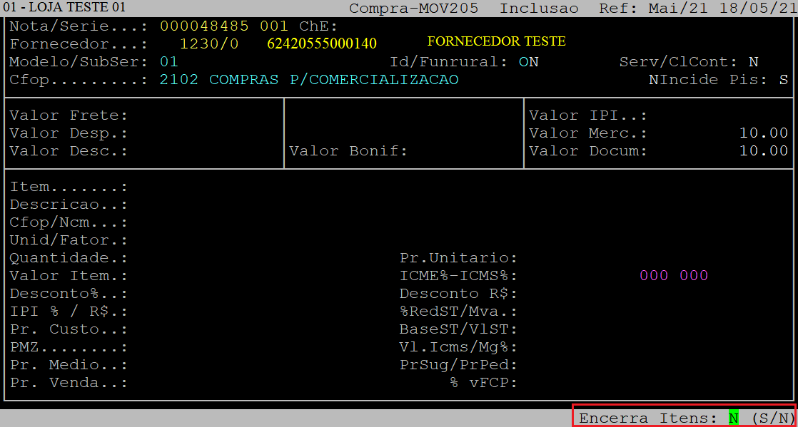Para finalizar a inserção de itens, pressione a tecla Esc. Em seguida ao ser exibida a pergunta " Confirma? ", pressione a tecla Enter ou informe a letra S para confirmar.
