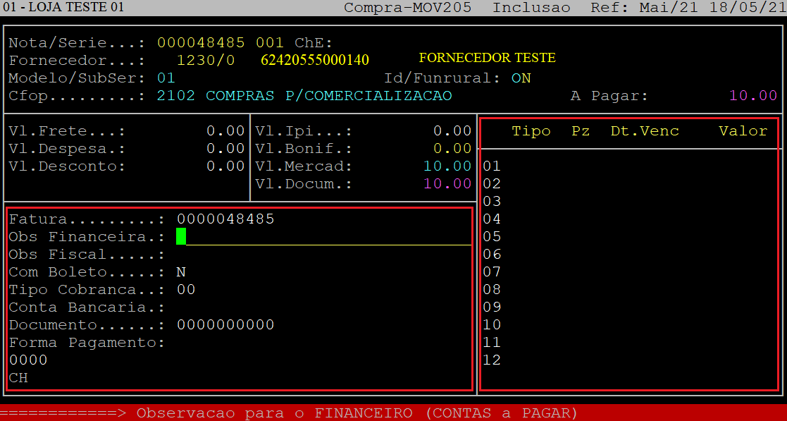 Obs Financeira: | Informe uma observação para o financeiro para ser exibida no Contas a Pagar e, aperte a tecla Enter. Se não desejar informar uma observação, apenas aperte a tecla Enter para prosseguir. | |