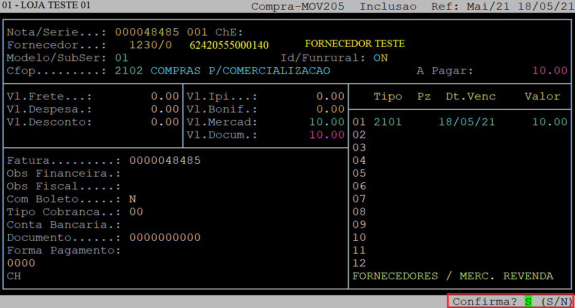 Em sequência, o sistema exibirá a pergunta " Confirma? ", no qual deverá apertar a tecla Enter ou S para confirmar os dados financeiros.