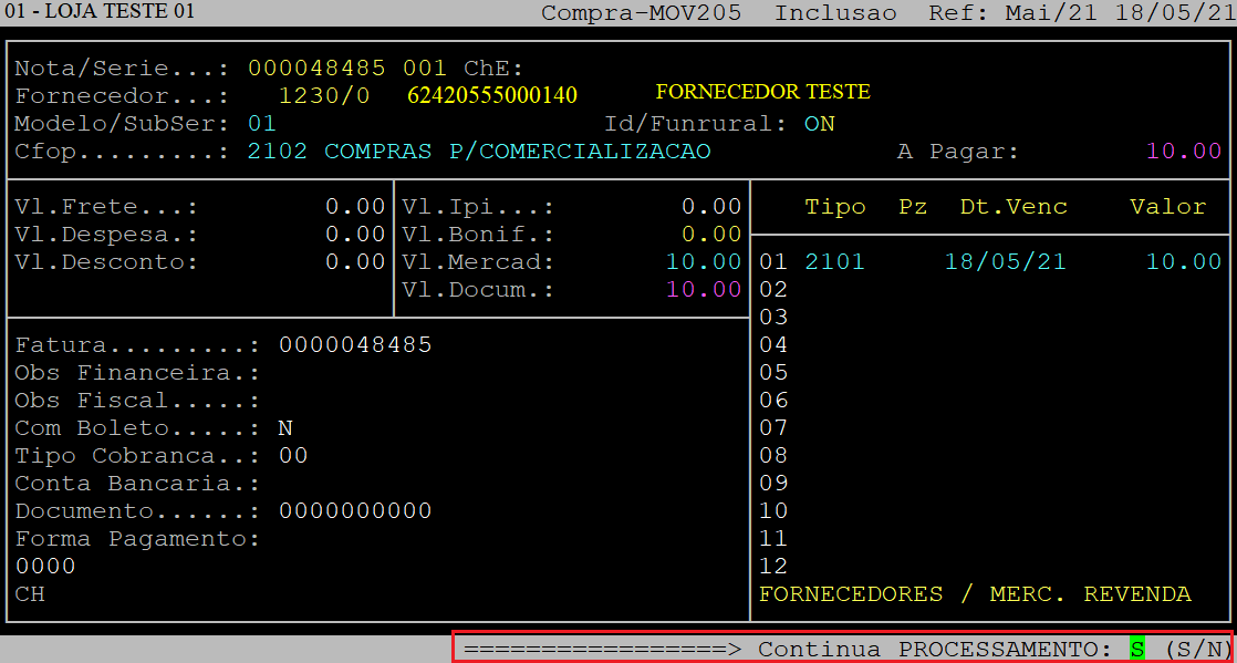 Ao ser exibida a pergunta " Continua PROCESSAMENTO: " informe a letra S para prosseguir, ou a letra N para não prosseguir.