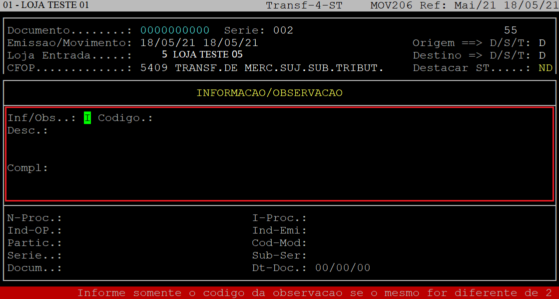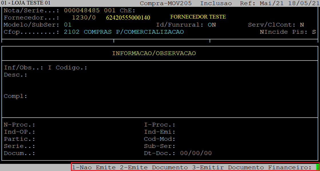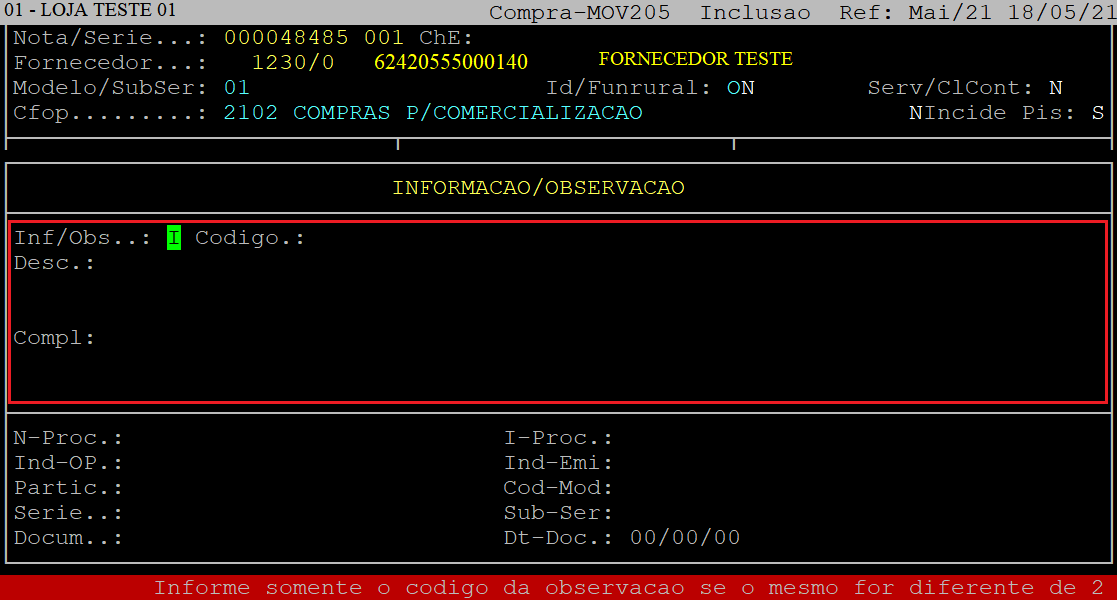 Se não desejar informar, aperte a tecla Esc para finalizar. No exemplo deste documento não foi informado nenhuma observação / informação.