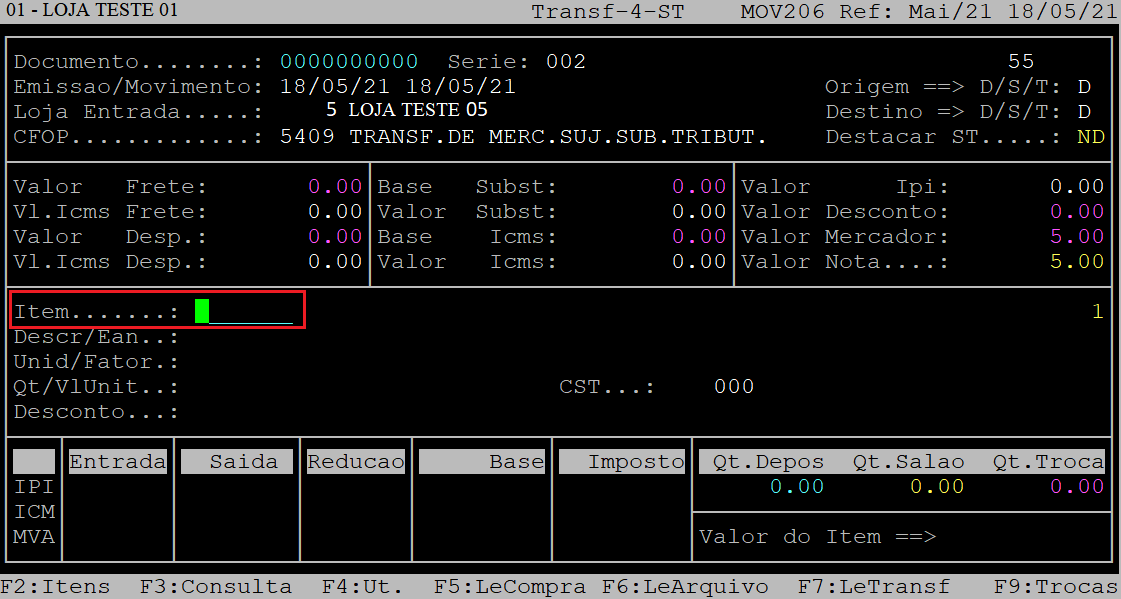 Ao acessar a rotina TRANSFERENCIA Saida, pressione a tecla Enter para percorrer pelos campos até alcançar o campo TrVal.