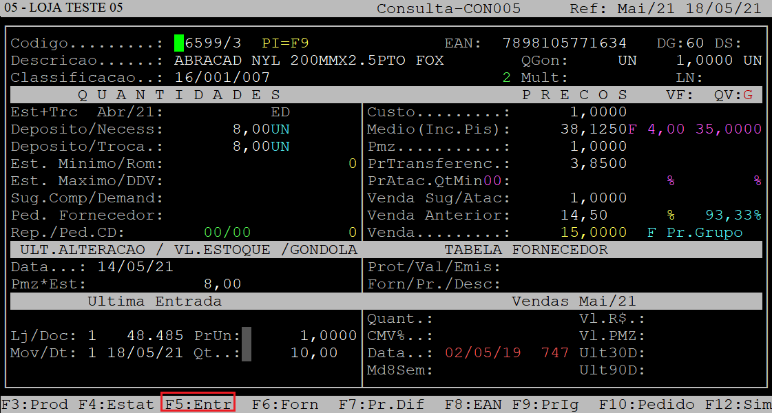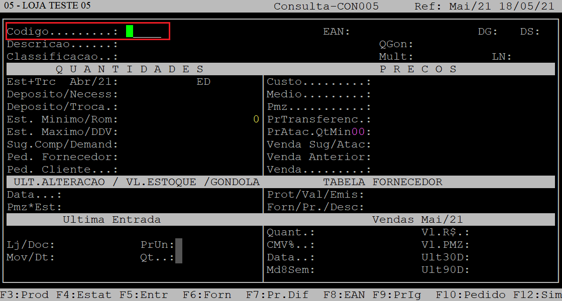 Informe o código do produto, que esteja cadastrado no sistema (com o dígito verificador) e, aperte a tecla Enter para carregar seus dados. Se não souber, é possível informar a descrição ou o EAN (código de barras) do produto, para isso pressione a tecla Enter para alcançar os campos Descr/EAN. No campo Descr (descrição) ainda, é possível consultar o produto pressionando a tecla F2. |