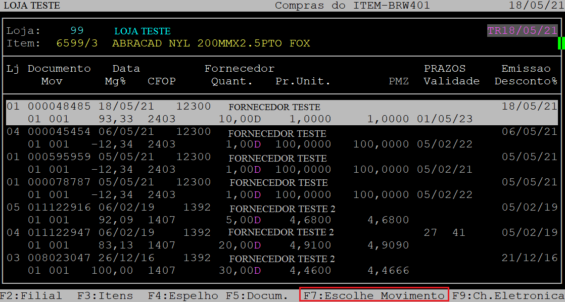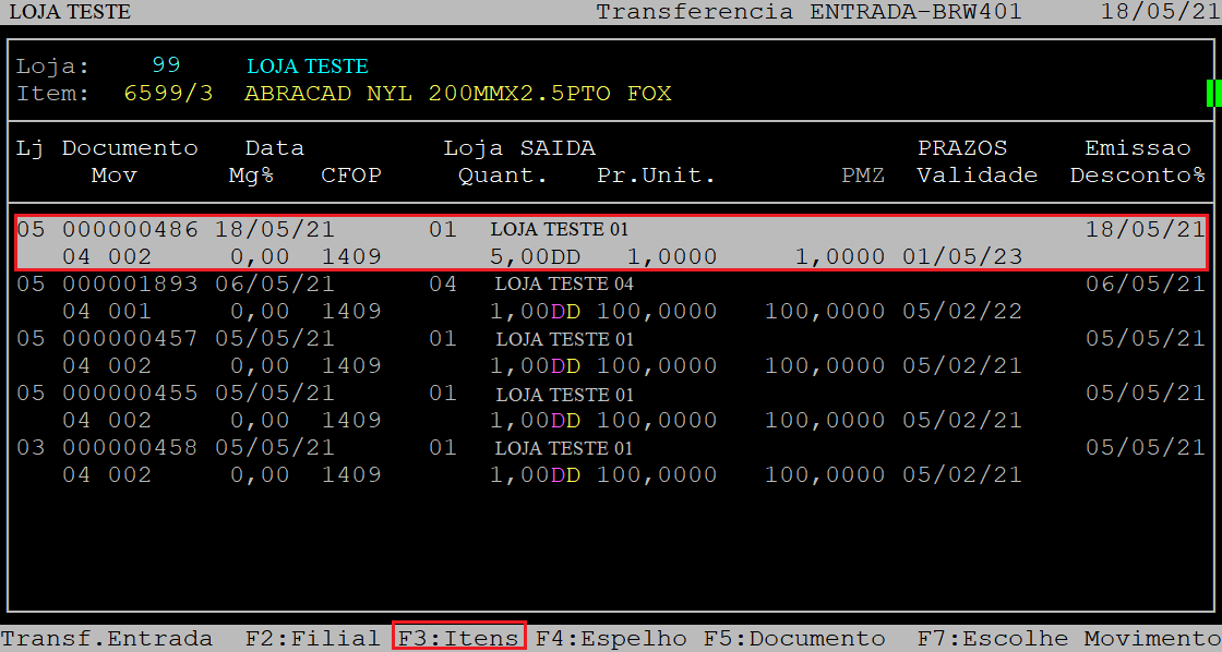 Posteriormente, será exibido na tela as notas fiscais com o tipo de movimento de entrada transferência. Se necessário, utilize as setas do teclado para selecionar a nota deseja e, aperte a tecla F3 para visualizar os itens. Caso a nota seja a primeira a ser exibida, apenas aperte a tecla F3.