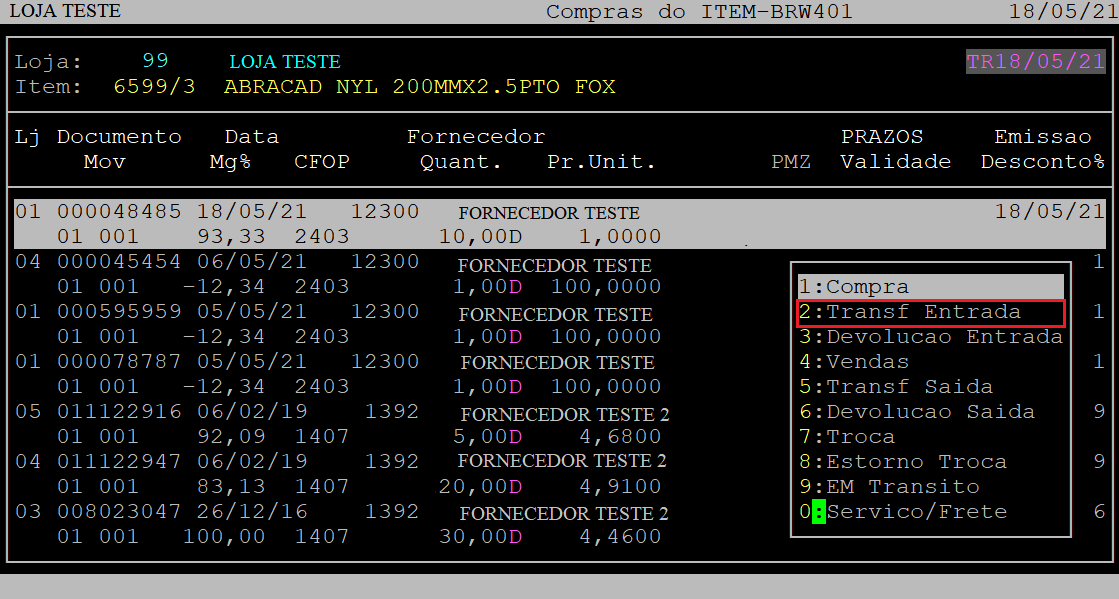Ao abrir a janela de tipo de movimento utilize a seta do teclado para baixo para selecionar a opção 2 - Transf Entrada e, aperte a tecla Enter para confirmá-la.