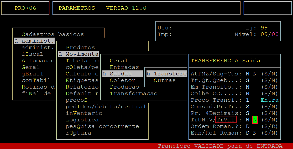 No campo TrVal, informe a letra S para enviar a validade do produto gravada na nota fiscal de saída de transferência para a nota de transferência de entrada, ou N para não enviar.