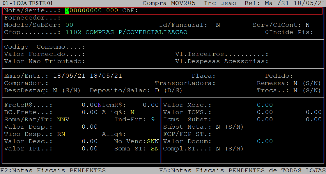 Emissao/Movimento: | Esse campo é preenchido automaticamente com a data em que a nota está sendo processada no sistema, pressione a tecla Enter para prosseguir. |