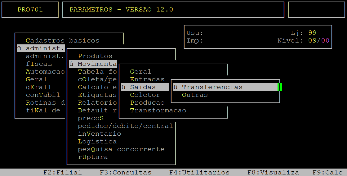 Para consultar a gravação da validade do produto na entrada da nota fiscal de transferência, no Menu Principal do sistema ou ao finalizar qualquer rotina, acesse a localização citada acima. Utilize as setas do teclado para selecionar os caminhos e, pressione a tecla Enter para confirmá-los.