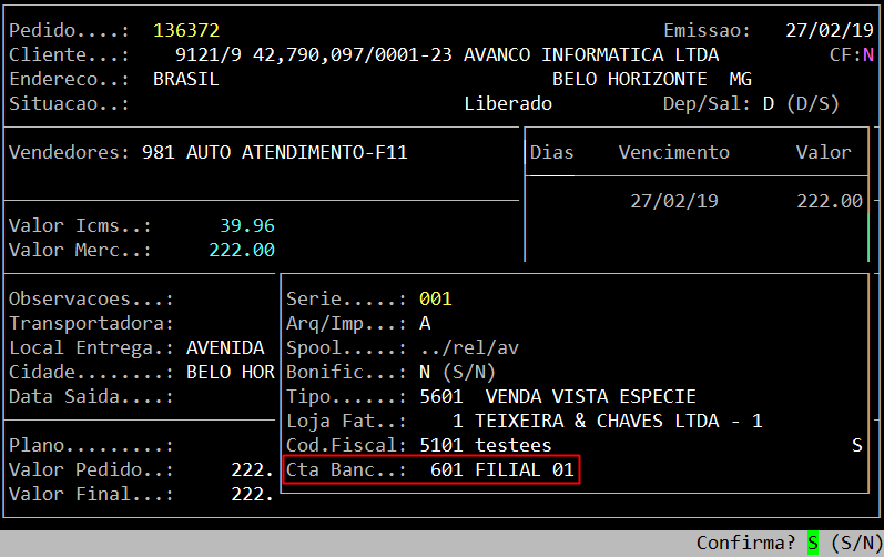 Confirme a inclusão do pedido de venda.