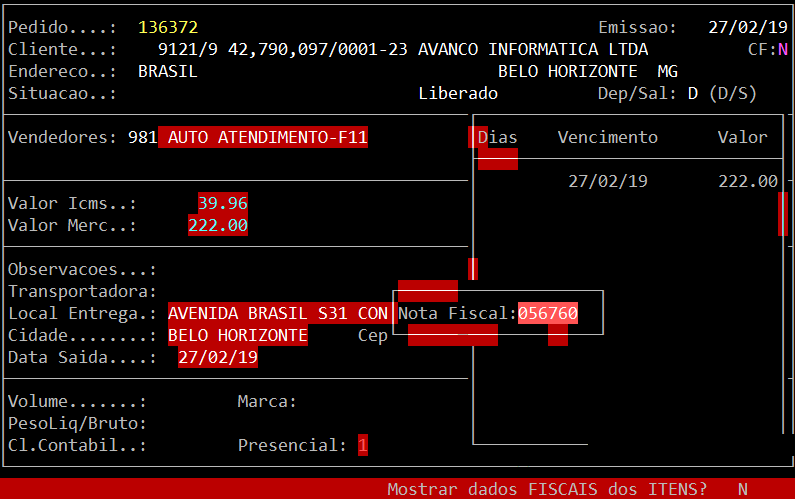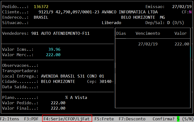 Ao acessar a rotina, informe o número do pedido e em seguida, pressione a tecla F4: Série/CFOP/LjFat.