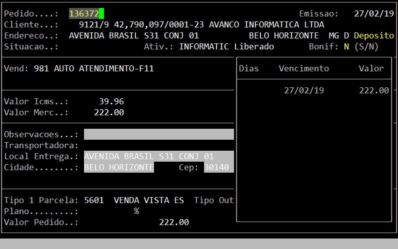 Localização: | Administracao de Materiais / Gestao de Vendas / Pedidos / Inclusao |