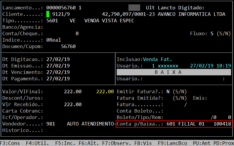 Ao acessar a rotina, informe o número da Nota Fiscal que deseja consultar. No exemplo abaixo, note que a conta para baixa foi gravada corretamente no lançamento.