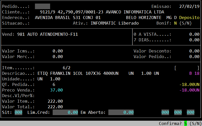 Ao acessar a rotina, informe o cliente e o item a serem incluídos no pedido, conforme o exemplo abaixo.