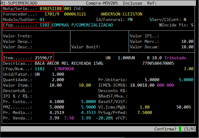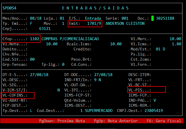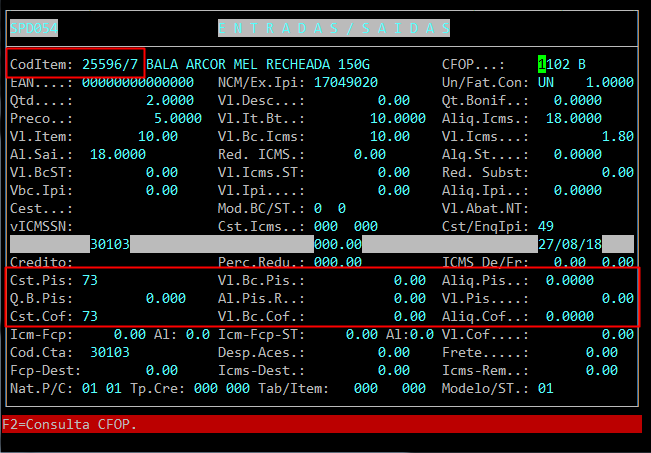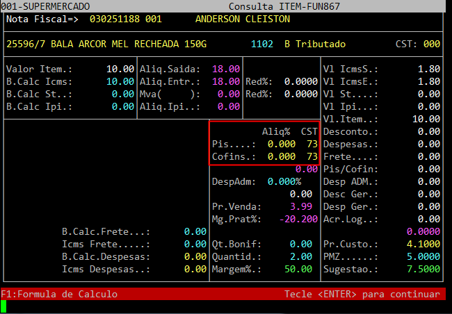 Após o lançamento do item, pressione a tecla F4 para visualizar o cálculo, nessa tela é possível ver que não foi calculado o crédito do PIS/COFINS.