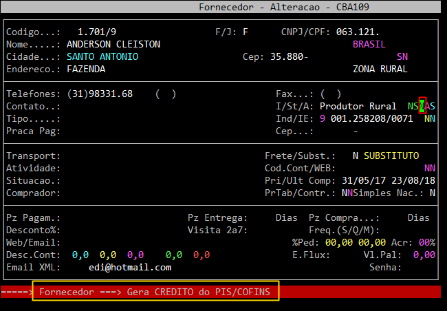 Informe N no parâmetro onde o sistema questiona se o fornecedor gera crédito do PIS/COFINS.