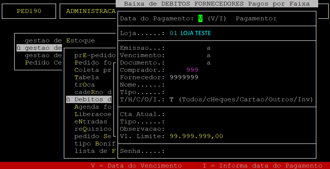 Data do Pagamento: | Informe a letra correspondente ao tipo de data desejada, sendo: V - data de vencimento, I - data de pagamento. |
