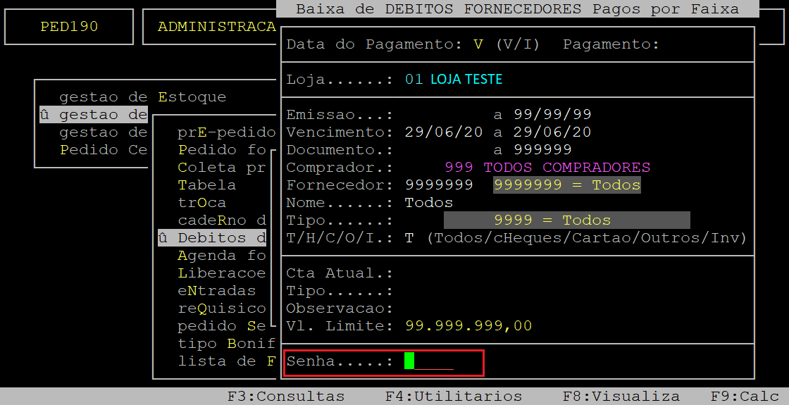 Rotina: | Baixa de DEBITO FORNECEDORES Pagos por Faixa |