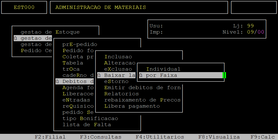 Localização: | Administracao Materiais / Gestao de Compras / Debitos de Fornecedor / Baixar Lancamento / por Faixa |