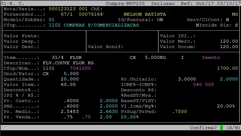 | Localização: | F5 / Administração.Materiais / Movimentação / Entradas / Compras |