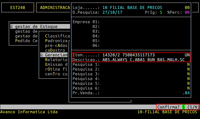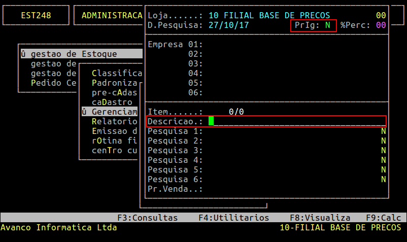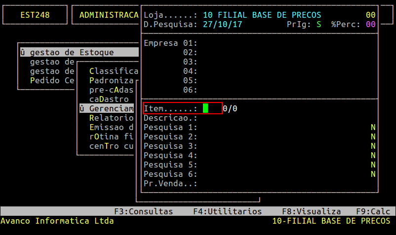 Localização: | Adm Materiais / Gestão de Estoque / Gerenciamento Filial / Pesquisa de Preços / Manutenção / Manutenção |