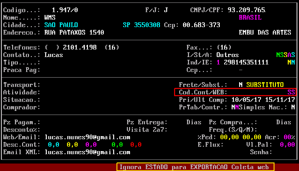 Informe o código do fornecedor e pressione Enter para navegar nos campos até chegar no campo WEB, conforme exemplo abaixo e informe S para que o sistema ignore o Estado para exportação da coleta WEB.