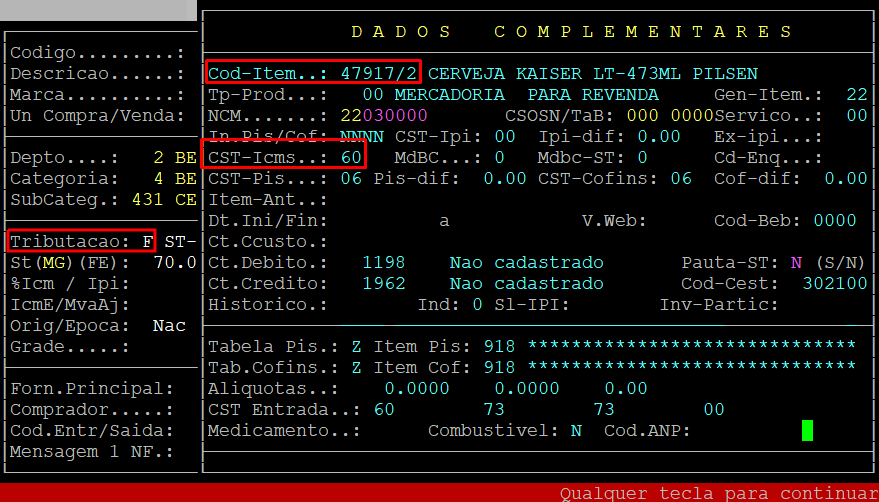 Observe que no exemplo abaixo, a tributação é substituição tributária (representado pela letra F no sistema Avanço) e o CST ICMS é 60, sendo uma combinação compatível.