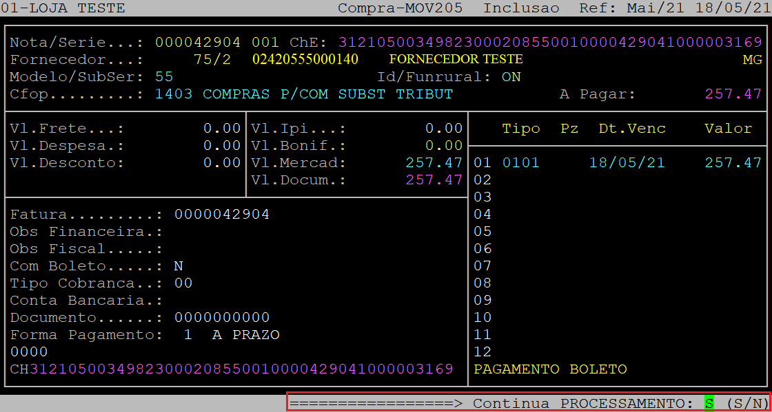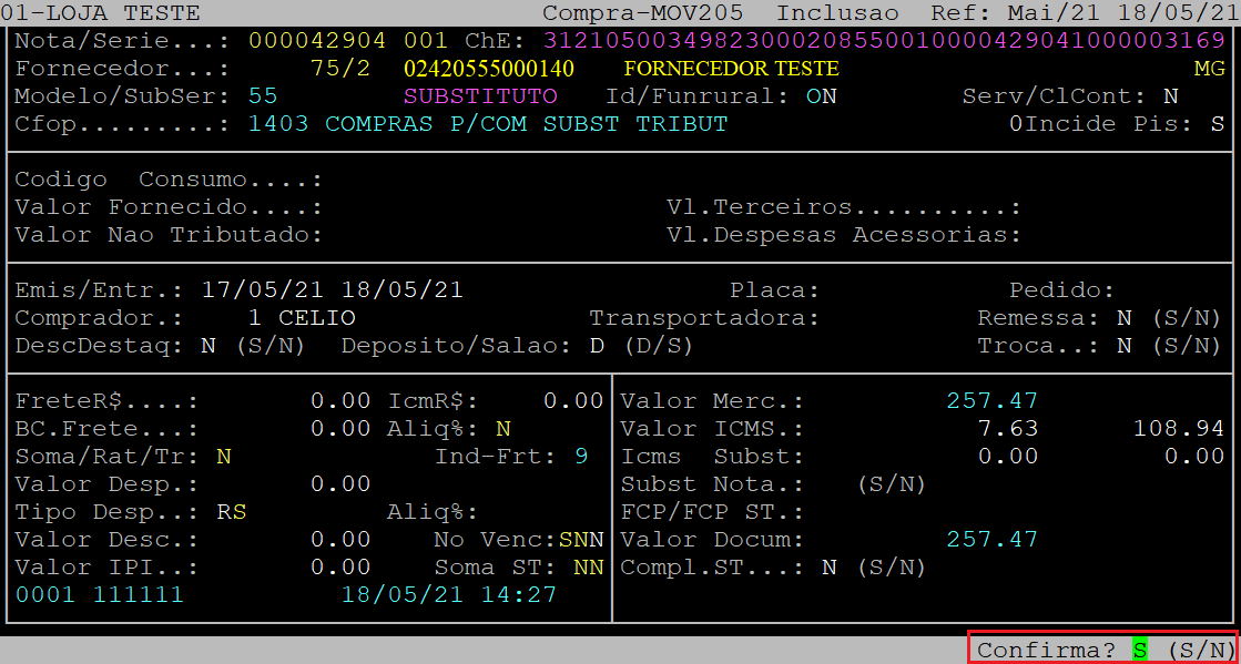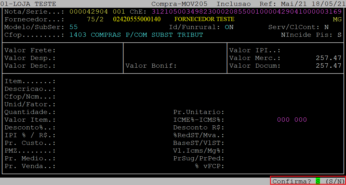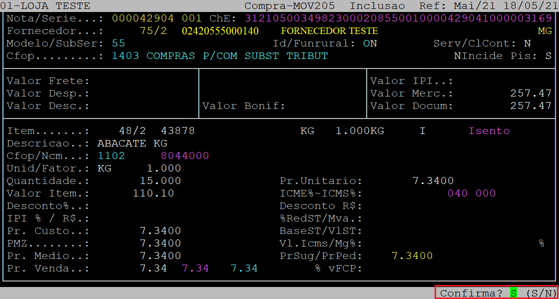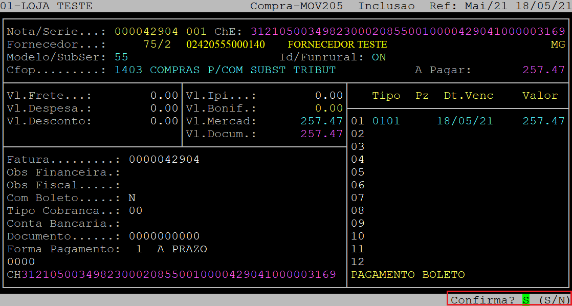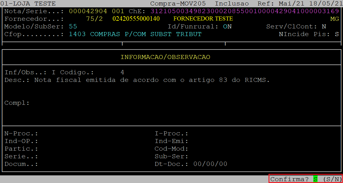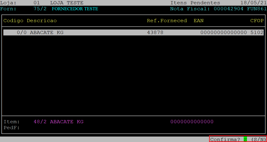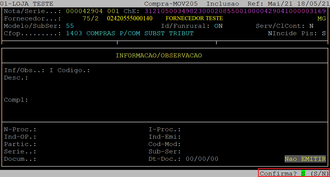 Após informar os dados da tela acima, ao ser exibida a pergunta " Confirma? ", aperte a tecla Enter ou S para confirmar.