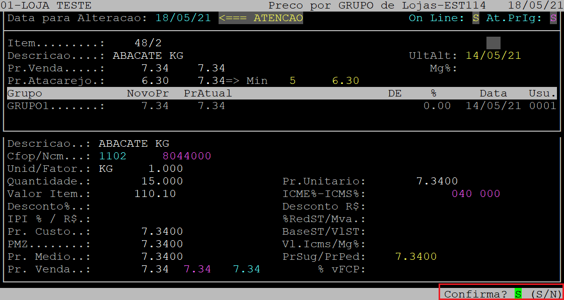 Em seguida, o sistema exibirá a pergunta " Confirma? ", no qual deverá apertar a tecla Enter ou S para confirmar a alteração realizada no (s) preço (s) do produto.