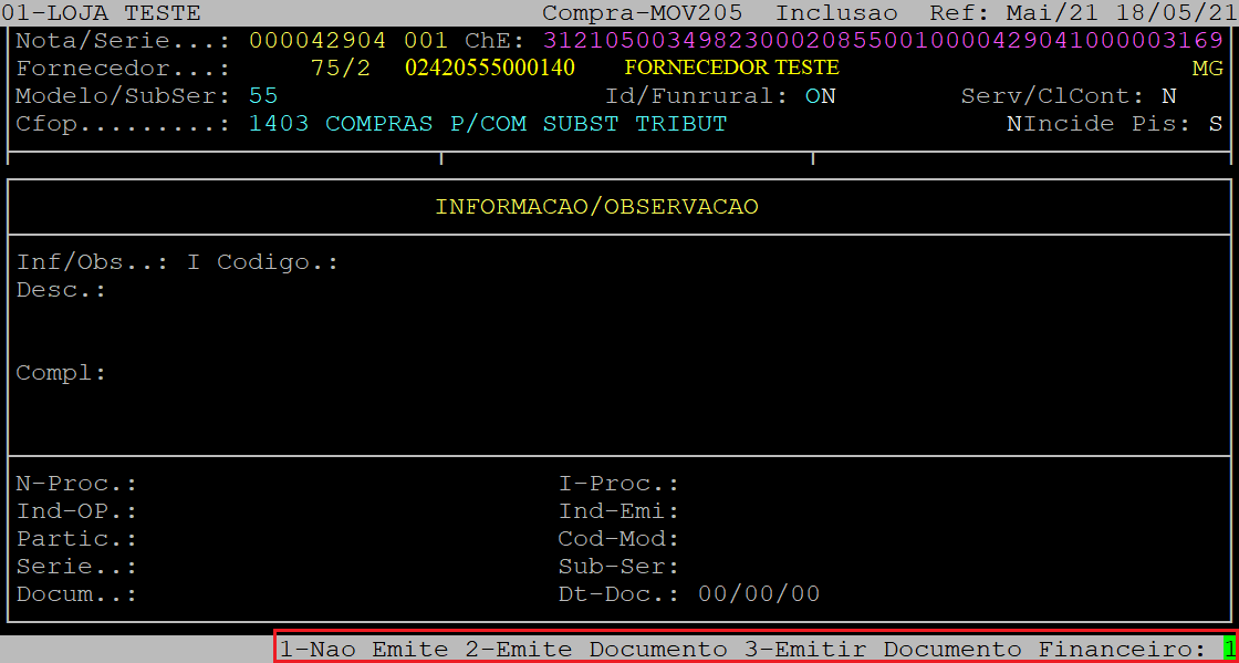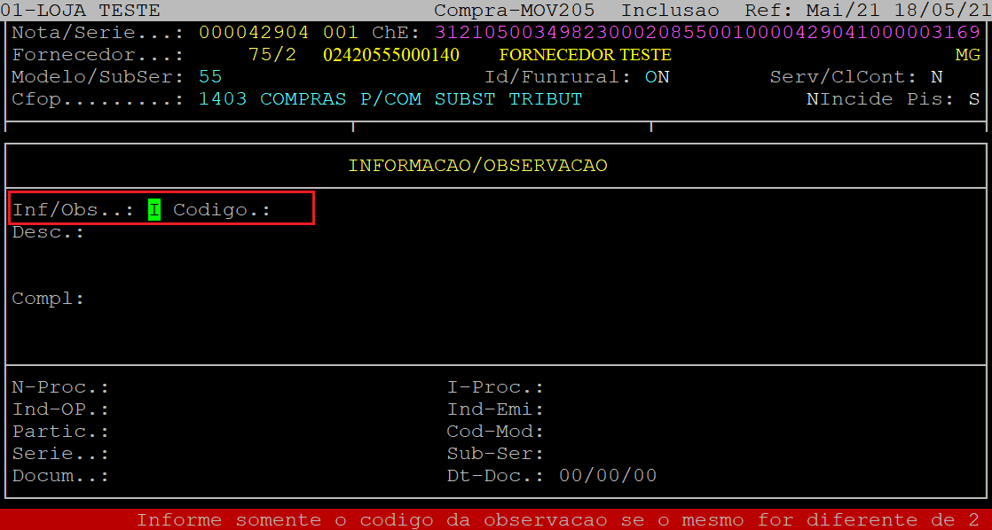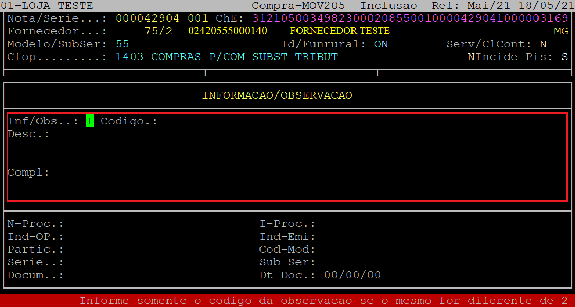 Se não desejar informar, aperte a tecla Esc para finalizar. No exemplo deste documento não foi informado a observação/informação.