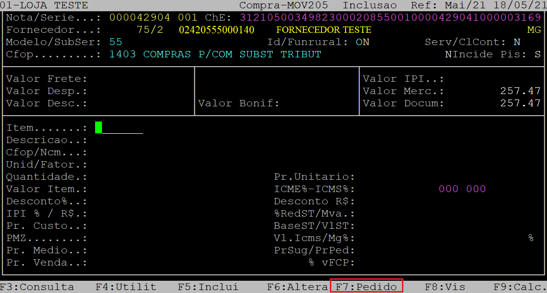 Em seguida, será aberto a tela de inserção dos produtos. Aperte a tecla F7 para carregar os produtos do XML.