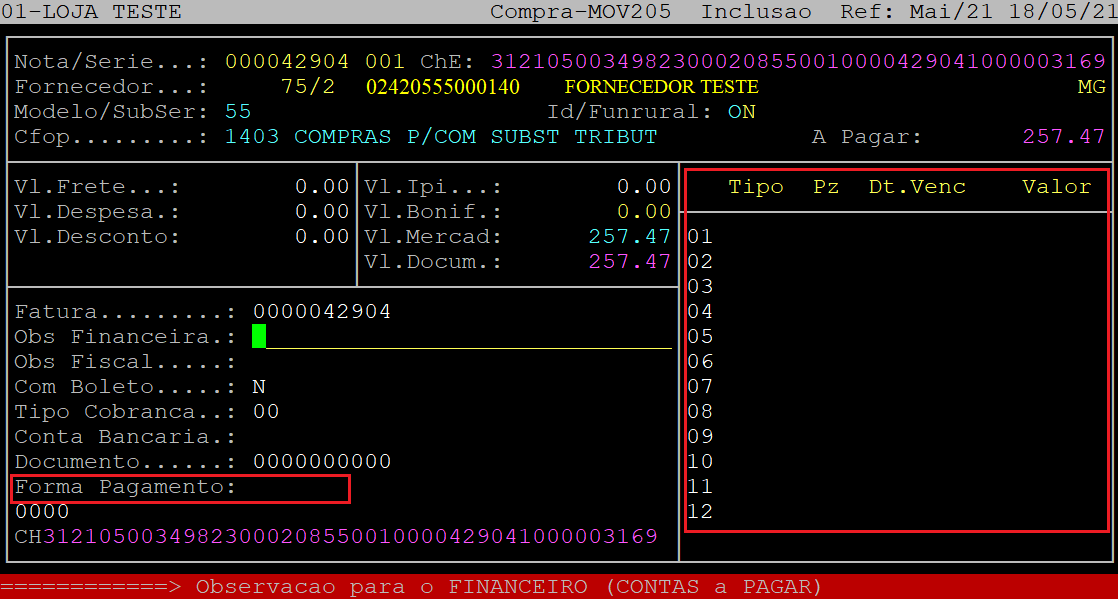 Obs Financeira: | Informe uma observação para o financeiro para ser exibida no Contas a Pagar e, aperte a tecla Enter. Se não desejar informar uma observação, apenas aperte a tecla Enter para prosseguir. | |