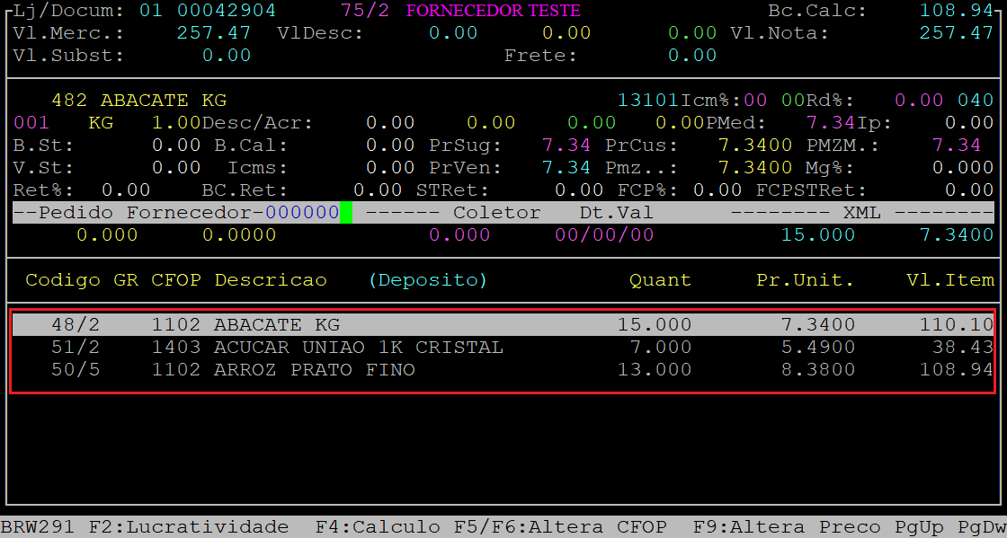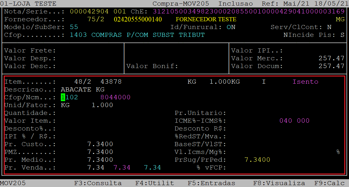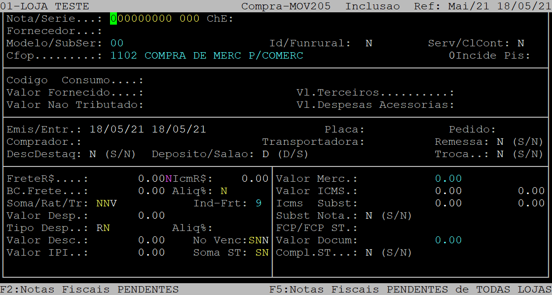 Logo após, será aberto a capa da nota contendo os dados preenchidos provenientes do XML. Pressione a tecla Enter para percorrer pelos campos.
