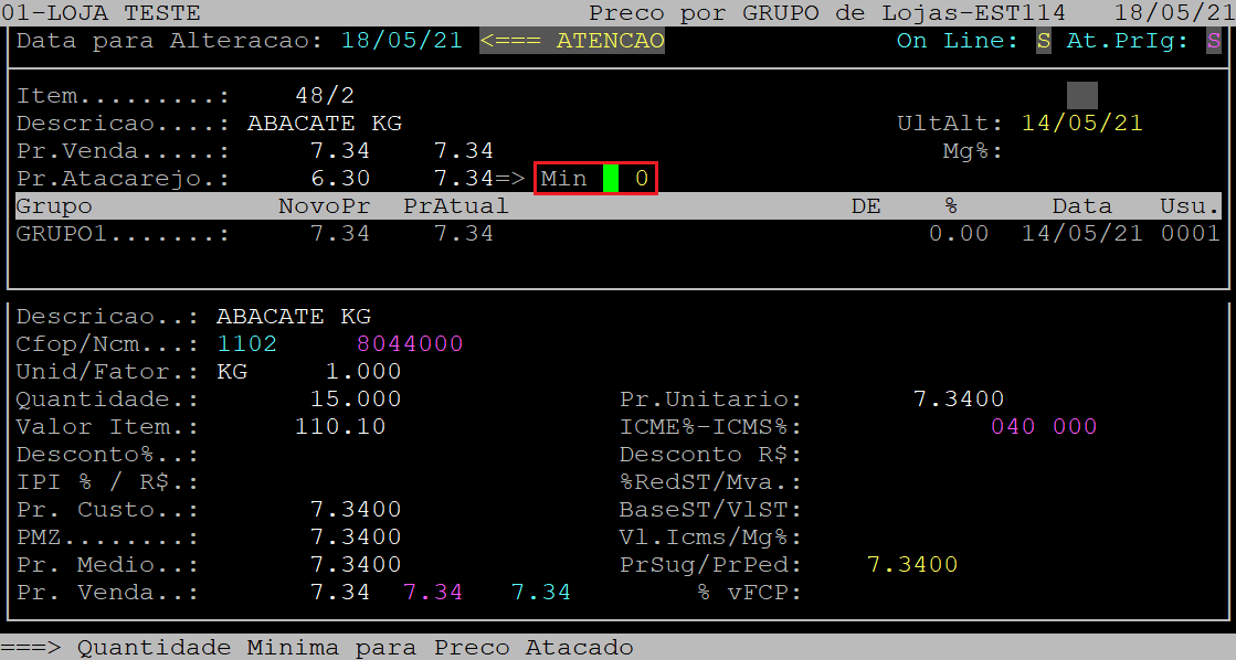 No campo Min, informe a quantidade mínima de compra do produto para considerar o preço de atacado (com três dígitos, podendo utilizar zeros a esquerda). Se não desejar alterar a quantidade mínima para atacado, apenas aperte a tecla Enter para manter a quantidade atual e prosseguir.