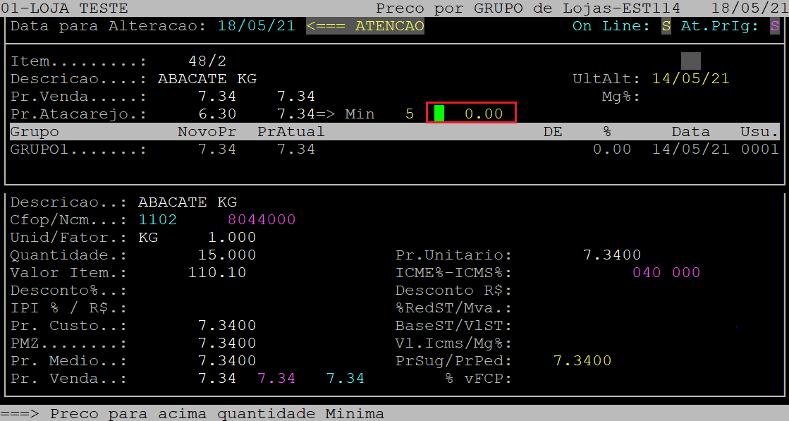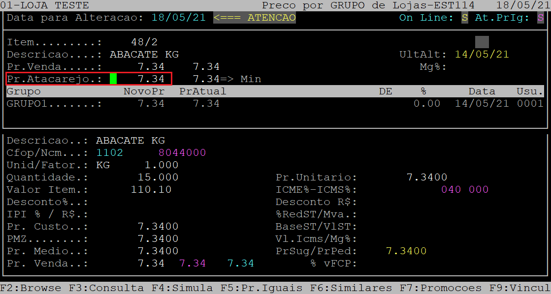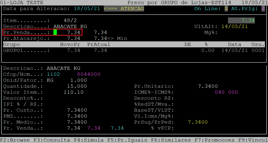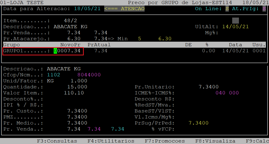 Após confirmar as primeiras alterações, o cursor do teclado se posicionará no campo NovoPr do primeiro grupo de loja.