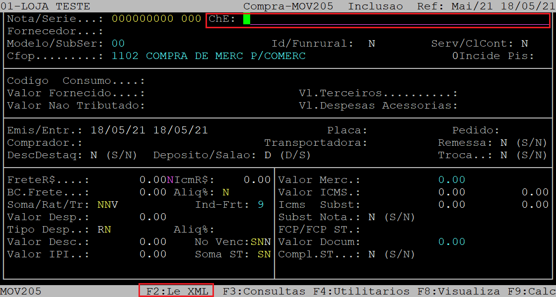 No campo ChE, aperte a tecla F2 para visualizar os arquivos XML das notas que estão pendentes para realizar a entrada.