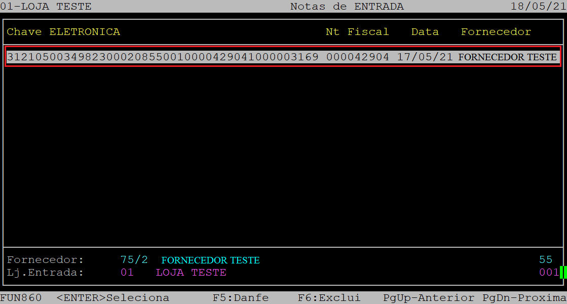 Em seguida, será exibido na tela os arquivos XML das notas que estão pendentes para realizar a entrada. Utilize as setas do teclado para selecionar o arquivo desejado e, aperte a tecla Enter para confirmá-lo.