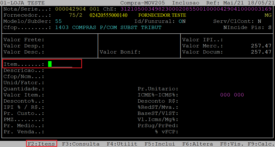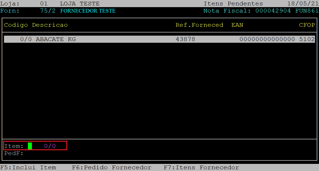 Após a confirmação, o cursor do teclado retornará para o campo Item.