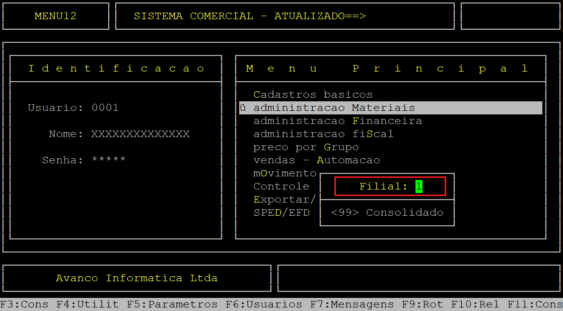 Caso possuir mais de uma loja configurada no cadastro de usuário, o sistema exibirá a janela de Filial, no qual deverá informar o número da loja desejada.